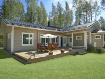 Традиционната финландска къща с тераса също е една от най -простите, затова често се избира като селско жилище. По правило тази малка вила с двускатен покрив има средна площ от 50 квадратни метра..