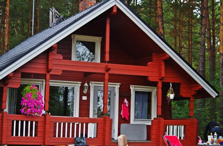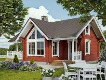 - Малка финландска вила в яркочервен цвят е идеална като крайградски дом. Миниатюрна едноетажна сграда с тавански етаж е скрита под черен двускатен покрив. Достатъчен брой средни прозорци в бели контрастни рамки осигуряват на интериорните пространства необходимото осветление. Верандата пада под покрива на къщата, което води до веранда, защитена от валежи.