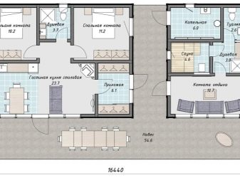 За да поставите сауната в къщата, е по -добре да дадете предпочитание на сглобяеми конструкции. В този случай два модула са разположени под един покрив: жилищен и спомагателен. Първият е изпълнен с кухня-хол, спални, баня и малък коридор. В помощния блок са организирани сауна, душ кабина, стая за релакс и помощни помещения.
