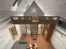 Типично оформление на мини вила предполага всекидневна на първо ниво, комбинирана с кухня, както и баня и сауна, и спални на тавана..