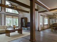 Ако вътрешните стени са оставени недовършени, тогава дизайнът не използва дървен декор. Напротив, голям плюс ще бъде създаването на отворено пространство, в което само спалнята, банята и помощните помещения са разделени с врати..