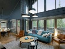 Умерено количество мебели, централно таванно осветление и големи прозорци, лишени от текстил, ще допълнят голямата картина.. Като цяло, за “вътрешността” на финландска вила, най -добре е да използвате пастелни и естествени нюанси..