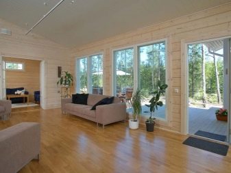 Височината на таваните не надхвърля границите на 2 метра 20 сантиметра. В повечето дизайнерски проекти подовите греди се държат отворени. Прозорците във финландските къщи са с големи размери, което ви позволява да поддържате добро осветление в помещенията. Вилите имат два изхода, скрити зад надеждно изолирани врати. Стаите във финландска къща винаги са просторни, а сауната също често се среща в дизайна..