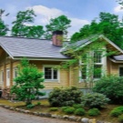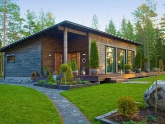 - Финландската вила изглежда много впечатляваща, състояща се от два модула, разположени под един скатен покрив.. Жилищното и помощното помещение, в което обикновено се помещава сауната, е разделено с проход, следователно, за да стигнете от едното до другото, трябва да излезете навън. Наличието на почти панорамни прозорци осигурява пълно осветление за малки помещения. По този начин в къщата няма веранда, но покривът образува необходимия навес, който ви позволява да организирате допълнителна зона за отдих на улицата. Самата структура изглежда много лаконична, запазвайки формата на равен правоъгълник. Външната декорация подчертава естествената красота на дървото, докато външните лампи придават уют на вилата..