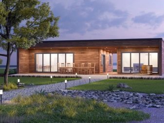 Панорамните прозорци, като втората светлина, ви позволяват да организирате висококачествено естествено осветление дори в малко пространство. Центърът на такава едноетажна вила е кухнята-хол с панорамни прозорци, отстрани на които има спални, бани и евентуално сауна. Обичайно е да се монтират покривите на такава къща на различни нива..