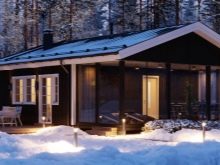 - Друга проста финландска вила придобива собствен вкус, благодарение на наличието на остъклена веранда с допълнително осветление. В къщата има два входа, единият от които се отваря към открита зона за отдих. Дървената конструкция е боядисана в тъмен нюанс, но вратата с отвори за прозорци, както и някои от гредите са подчертани в бяло.