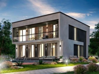 След това ще анализираме как можете да проектирате двуетажни стъклени къщи.. Най -често такива жилищни структури имат значителна площ. При декорирането на външни фасади се комбинират и различни материали (стъкло с дърво, пластмаса, бетон). Формата на къщите може да бъде различна (квадратна, правоъгълна, многоъгълна). На първото ниво ще бъде възможно да се поставят хол, кухня, кабинет, антре, както и техническо помещение. На втория етаж по -често са оборудвани 2 или 3 спални, детска стая. Банята, като правило, се предлага както на първо, така и на второ ниво..