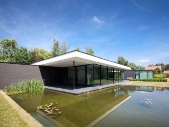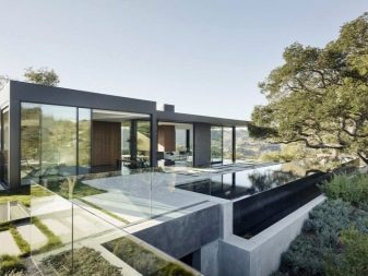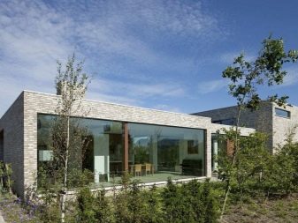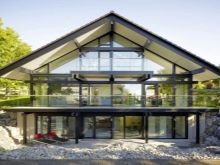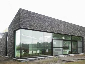 Едноетажна жилищна сграда, украсена с големи стъклени панели, ще изглежда лаконично и спретнато. Част от сградата може да бъде завършена с тъмносиви каменни материали. В същото време е допустимо разделянето на панорамни прозорци с черни профили..