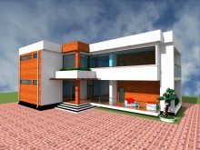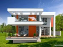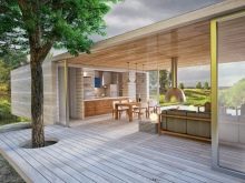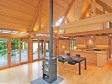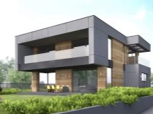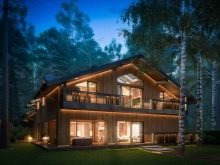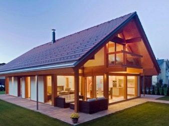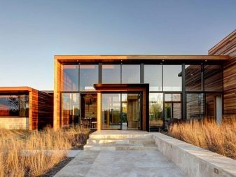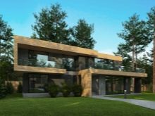 Друг интересен вариант ще бъдат жилищните конструкции с големи панорамни прозорци и дървени ламперии по външната фасада. Покривът може да бъде украсен и с дървени елементи. В този случай балконите, терасите и верандите също трябва да бъдат направени от висококачествено и обработено дърво..