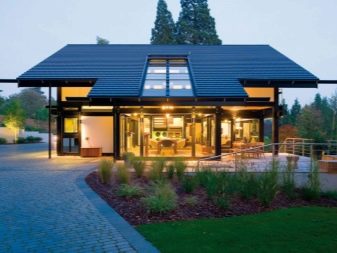 Такива дизайни ще изглеждат възможно най -модерни, красиви и спретнати. В този случай специална метална керемида се използва главно като покривен материал..