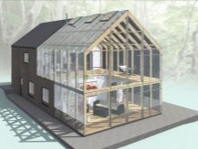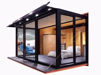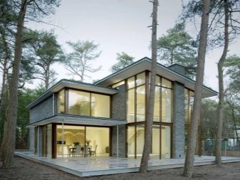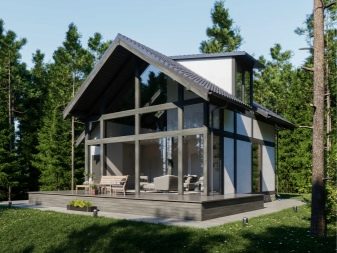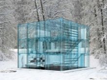 Малките къщи с метални и стъклени фасади в гората изглеждат красиви. Такива сгради ще бъдат отличен вариант за отдих. Те често са оборудвани с различни издръжливи железни части. Оформлението в такива сгради може да бъде безплатно, ако е необходимо, се използват мобилни прегради. При желание е допустимо да се проектира куполна конструкция, тя също е предназначена за периодичен отдих на открито.
