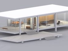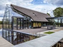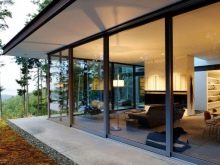Също така в проекта на голяма едноетажна стъклена къща можете да включите две просторни спални, голяма всекидневна (отделна или комбинирана с трапезария), кухня, баня, вестибюл, антре. Ако е необходимо, можете да осигурите две комбинирани бани едновременно. Ако къщата е предназначена за семейство с деца, тогава можете да оставите и място за организиране на зона за игра, детска стая.