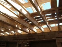 Таванският етаж в къща, построена от лешоядни панели, може да бъде направен по същата технология или под формата на позната дървена рамка. Вторият вариант е по -добър по отношение на звукоизолационните качества, а панелите са по -добри по отношение на запазването на топлината. Гредите са изработени от масивен дървен материал, изсушен в специални камери, който след това се рендосва до номиналния размер с помощта на модерно оборудване. Желателно е части от припокриването да пристигнат на строителната площадка, вече изрязани според проекта..