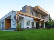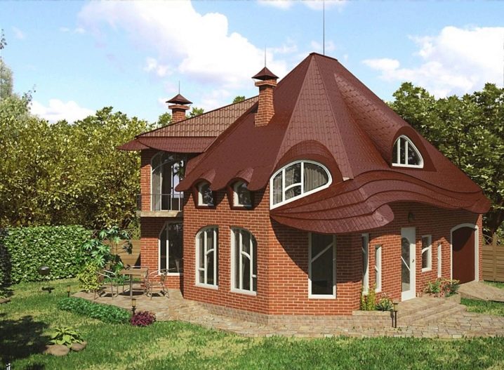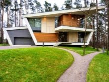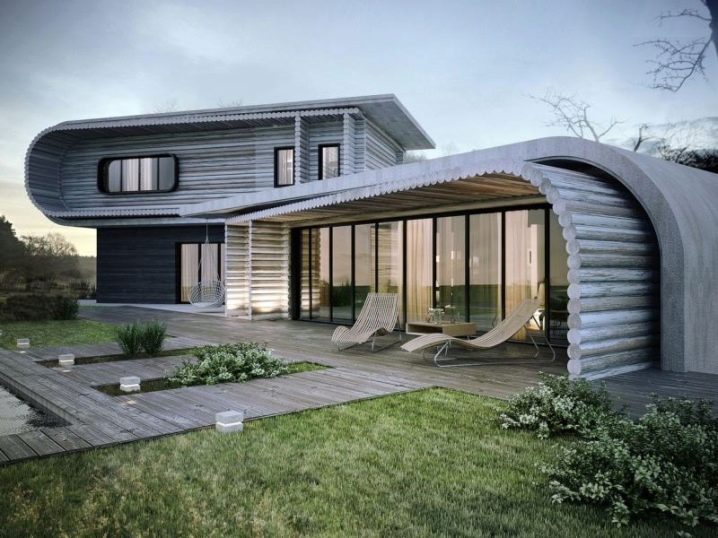 - Ако сте уморени както от класика, така и от високи технологии, използвайте например необичаен проект, кои характеристики са както следва. Вторият етаж е около половината от размера на първия – и двете части на сградата са като две крила, изместени върху плана един спрямо друг под тъп ъгъл. Външните стени са кръгли, а основната настилка в краищата и на тавана на покрива също е закръглена. Крайните стени постепенно се превръщат в тавана, без да имат ясно обозначение, а самата конструкция е лишена от таванско помещение – покривната палуба („пай“) е плоска, успоредна на хоризонта. На първия етаж – панорамно остъкляване на прозорци и врати, на втория – прозорци със заоблени ъгли на рамките.