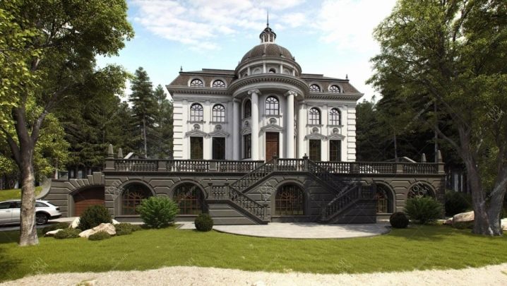- Един пример е къща в стила на европейския класицизъм, в която има място за колони на входа, полукръгъл балдахин, който смътно прилича на еркер и дори кула над него. Цокълът е с много по-голяма площ от първия или втория, намира се под вътрешния двор, към който посетителите се изкачват по една от страничните двуетажни стълби, построени вляво от централната част на фасадата на цокъла.