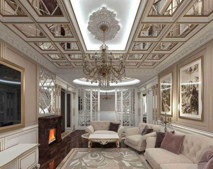 Зала или всекидневна в огледални отражения има къдрави рамкови конструкции, вградени в тавана и стените, в които се вмъкват чаши. Тези дизайни смътно приличат на истински крила на вратите, вградени в стената като декорация, но без дръжки на вратите..