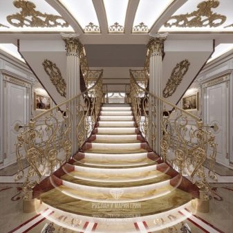 Стълбите към втория етаж са направени под формата на трилентова конструкция. Две странични и една централна имат ковани парапети, но самите те са отливани от стоманобетон и облицовани с мрамор или порцеланови каменни изделия.
