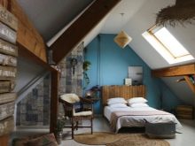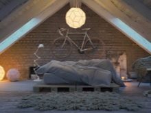 Таванската спалня в стил таванско помещение е декорирана в меки цветове. Същите мебели – светло лилаво, светло зелено – контрастират с напълно сивата, но луксозно декорирана стая.