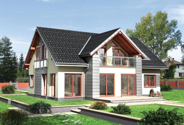 - Вила-предимно двуетажна къща или едноетажна къща с таван. Проста, но шик по свой начин версия на селско имение има два пълни етажа. Фасадата в средата е оборудвана с панорамни прозорци, има веранда с козирка, която е под и опора за лоджията или хола на втория етаж. Това е класическа версия, която не съдържа еркери в плана..