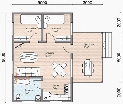 - 6х9 м с разширение: хол, 2-3 спални, кухня, баня;