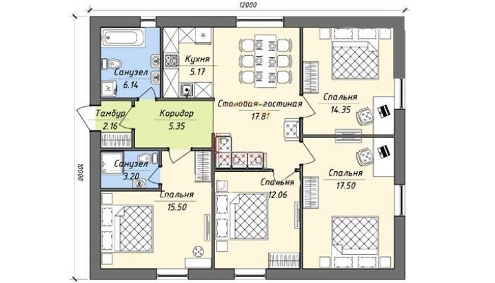- 10х12 м, без таванско помещение, с разделяне на две разграничени зони: жилищна и битова;