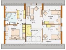 Най -често срещаните идеи – изнасяне на детската стая или спалнята към мецанина. Недостатъкът на това решение е, че през лятото е необходима честа вентилация през нивото на горния прозорец, тъй като понякога е невъзможно да заспите от задух. Но в полярните ширини, където има много по-малко светлина, отколкото на юг, когато слънцето е ниско над хоризонта, а зимите могат да бъдат дълги и облачни, къща с две височини е оправдано решение. Мецанинът според SNiP не може да заема повече от 40% от площта на хола.