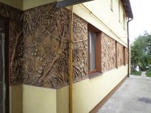 Външният дизайн (екстериор) на селска или селска къща върви ръка за ръка с основните строителни материали, от които е построена сградата. Тухлени, каменни къщи, стени от блокове от пяна или газобетон, препоръчително е да се подреди метод с малки плочки или мозайка. Ако окончателната мазилка вече е нанесена – и е втвърдена, тогава можете да украсите стените с декоративна 3D картина, като поканите художник, който професионално рисува и копира художествени модели, като ги смила върху твърда повърхност с помощта на ръчна мелница.