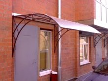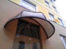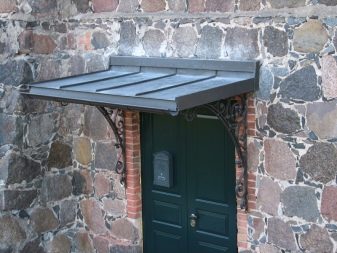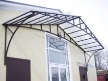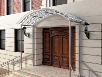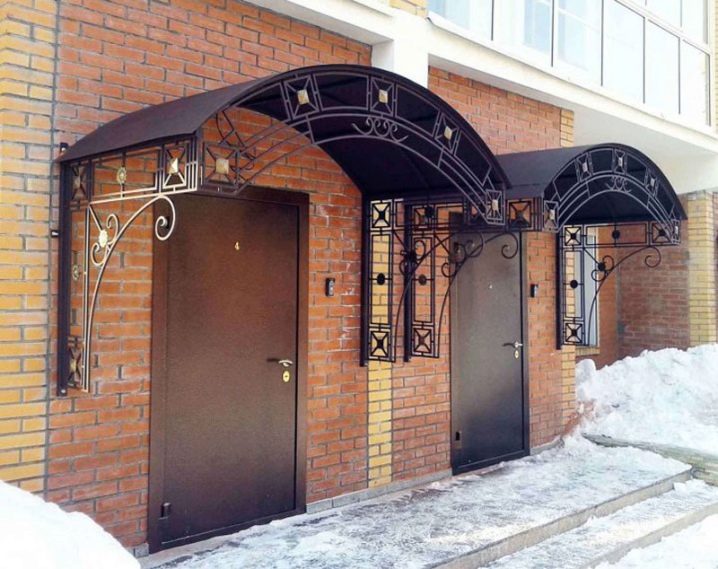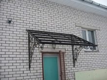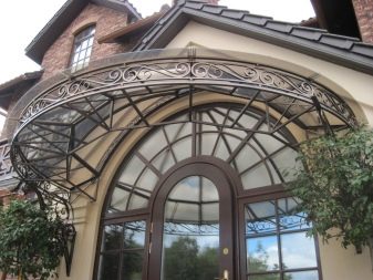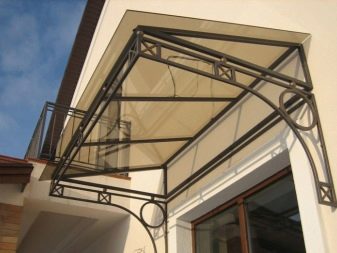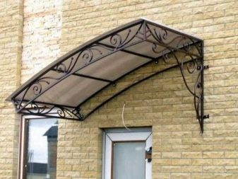 - Разглежданите видове козирки изглеждат привлекателни на фона на различни фасади на къщи.. Металната основа може да бъде боядисана във всеки подходящ цвят за по -хармоничен дизайн.