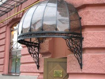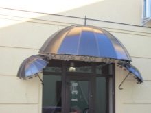 - Сферичен (купол). Това е една от най -ефектните и луксозни форми на метални козирки. Такива конструкции, правилно монтирани над вратата, не само изглеждат шикозно, но и демонстрират висока надеждност. Те са съставени от няколко извити сегмента, така че се оказват много сложни и капризни в производството. Но куполният навес с рамка от метален профил е в състояние да предпазва добре от дъжд и сняг от всички страни..