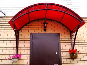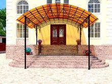 - Често метал се използва само като рамка за балдахин. На такава основа могат да се полагат различни материали. Често хората избират поликарбонатни листове, прозрачни или цветни. С такива компоненти входната зона изглежда много естетически приятна..