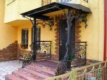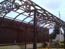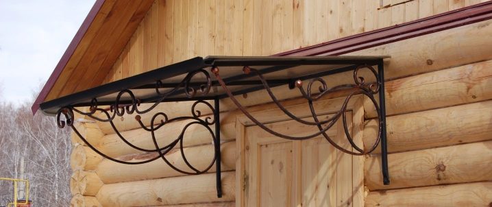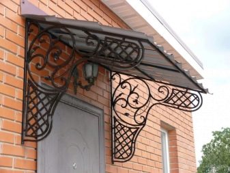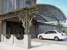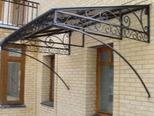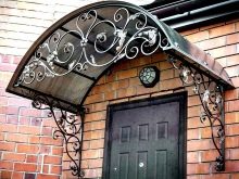 - Коване. Кованите козирки изглеждат особено представителни и богати, но също така стоят съответно. Такива структури изглеждат хармонично на фона на къщи, проектирани в солиден класически стил. Няма да е възможно да инсталирате кован навес самостоятелно, тъй като за извършване на такава работа трябва да имате определени знания / умения. Трябва да се консултира само с професионалисти.