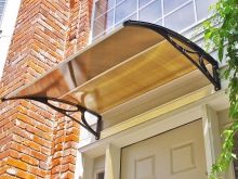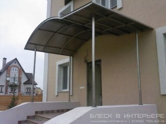 - Прикрепените метални козирки с поликарбонатно покритие изглеждат стилно и модерно, в дизайна на които няма странични опори. Подобен елемент изглежда ефектно над вратата, около която има вградени улични лампи..