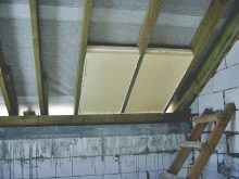 Следва ред на таванната пароизолация – тя се осигурява от пластмасови филми, пергамин или покривен материал. При закрепване на такива материали към гредите се нанася лепило или се напълват летви на стъпки от 0,4-0,5 m.