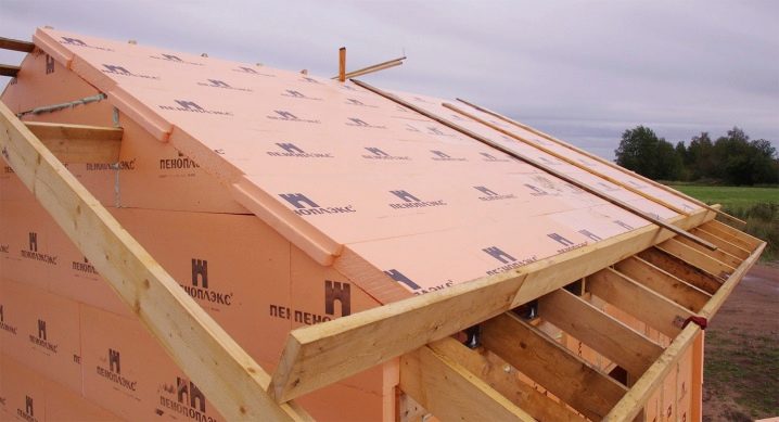 За външна изолация на тавана (засилване на термичната защита на покрива му) могат да се използват само плътни материали от конструкция на плочи. Повечето майстори препоръчват използването на penoplex в този случай, тъй като той се проявява много добре в това качество. Заковавайки дъска, равна на ширината на изолацията към гредите, можете да избегнете плъзгането й надолу. Плочите трябва да бъдат подредени в шахматна дъска. За създаване на решетката се използват пръти, дебелината им не може да бъде по -малка от 4 cm.
