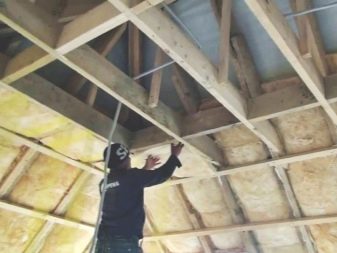 Опитните майстори отдавна са разработили технологията за изолация на тавана отвътре и стриктно я спазват. За да покриете горната част на изолацията от влага, трябва да заобиколите всички дървени греди и да прикрепите специален филм с помощта на телбод или вертикално насочени ламели. Полага се на слоеве с припокриване, закрепването се извършва със специална лента. След това се създава щайга, която е направена от релси с ширина 80-100 мм, натъпкани върху гредите успоредно един на друг.