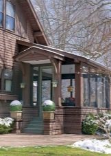 - Затворен. Напълно затворени веранди със стени и покрив също са много популярни. Такива опции са прикрепени конструкции, които могат да бъдат направени от различни материали, включително стъкло. Такива пристройки са добри с това, че напълно покриват входната зона, ставайки част от фасадата на сградата. Вътре в тях можете дори да поставите отоплителни устройства или да инсталирате система за топъл под, в резултат на което верандата се превръща в пълноправен вестибюл, в който не е студено.