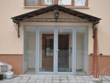 Ако входната група се установи в селска къща или в къща, където собственикът планира да живее изключително през топлия сезон, можете да изберете входна група от поликарбонат. Листовете от този материал са полупрозрачни и помагат за създаването на минималистичен дизайн. За по -стилен външен вид можете да украсите сградата с ковани елементи..
