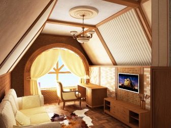 - Таванът и стените на тавана са обшити. Има две възможности за довършителни работи: традиционна (с използване на различни видове дърво: облицовка, имитация на дървен материал, блок хаус) и модерна (с помощта на гипсокартон, коркови панели и др.). Дървената ламперия създава здравословен микроклимат в помещението и специална „селска“ атмосфера. Съвременните материали са по -лесни за инсталиране, с тяхна помощ можете да създадете интериор с всякаква сложност.