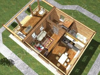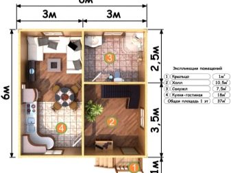 6×8 къщи с полезна площ 6×6 могат да бъдат допълнително оборудвани с руска печка, допълнителен гараж за мотоциклети и велосипеди, вградени в основното пространство.