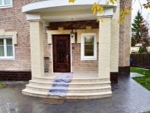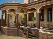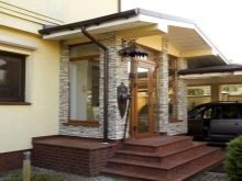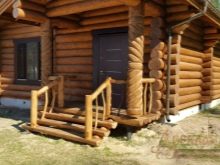 Дървено стълбище с парапет ще добави оригинален руски етнически привкус към фасадата. Дървена козирка, украсена с красиви резби, ще внесе оригиналност в цялостната композиция.