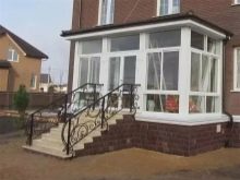 Някои смятат, че пластмасовите или металните конструкции не са подходящи за частна дървена къща, а тухлена вила, напротив, трябва да има само ковани парапети и бетонни стъпала. Тази гледна точка не винаги е оправдана.. Разбира се, стъпалата и фасадата, изработени от същия материал, изглеждат впечатляващи и завършени..