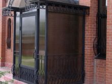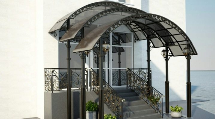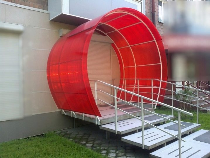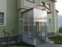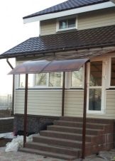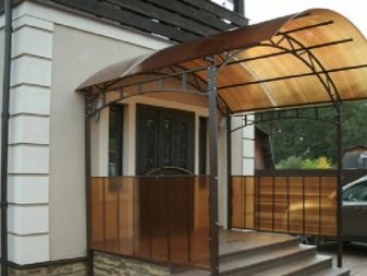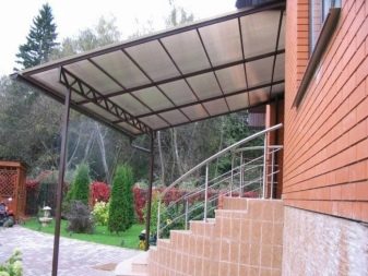 В ниската поликарбонатна веранда инсталацията е на нивото на земята. Не са предвидени стъпки. Само понякога има изключения от това правило, но не повече от 3 стъпки. Използват се предимно декоративни парапети, сред които се предпочитат ковани решения. Висока поликарбонатна веранда не е пълна без стъпала. Използва се, ако вратата е повдигната над околния двор..