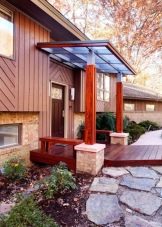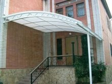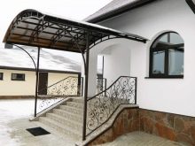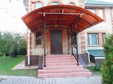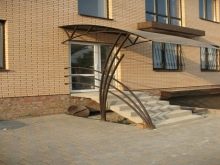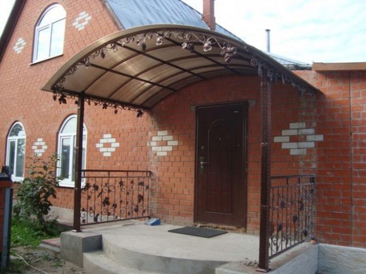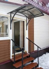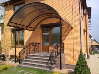 Снимката показва как може да изглежда комбинация от навес от поликарбонат с обикновени каменни стъпала и декоративна метална ограда. На фона на светложълта тухлена стена, това решение изглежда много привлекателно..