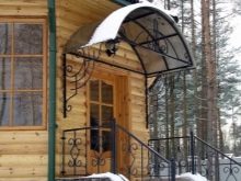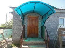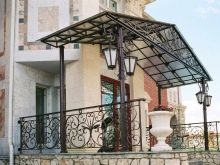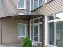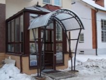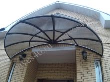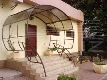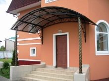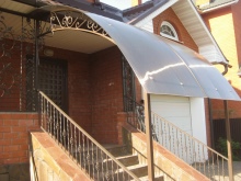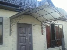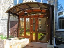 Не винаги се решава напълно да се направи конструкция от поликарбонат.. Но този материал се използва перфектно за образуването на “козирки”. С тяхна помощ е лесно да се постигне оригиналност и визуално да се допълни облика на сградата. В тази версия козирката всъщност замества самата веранда..