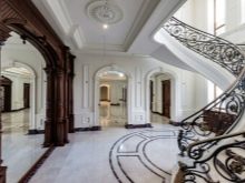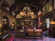 - Готически. Стил, свързан с мистика и древни замъци. Такава аура може лесно да се създаде във вашето имение, просто трябва да обърнете внимание на отличителните черти, които включват: цветовата схема на тъмните тонове (синьо, лилаво, бордо, виолетово), като завършек, по -често – мрамор, метал, стъкло, понякога дърво … Не забравяйте да използвате витражи, мазилки, резбовани врати. Голяма камина може да се превърне в централната част на интериора в хола..
