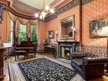- Викториански. Това е и въплъщение на лукса. Камината също е задължителна. В същото време цветовата схема е сдържана, но в декорацията има много позлата, тя може да бъде върху полилеи и лампи, рамки за картини и свещници, върху мебели. В текстила, от който трябва да има много, преобладават флористичните мотиви..