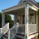 Между другото, той отеква много хармонично с полукръгъл прозорец и изглежда ефектно на фона на снежнобяла къща. Ниските стъпала на верандата са покрити с плочки.