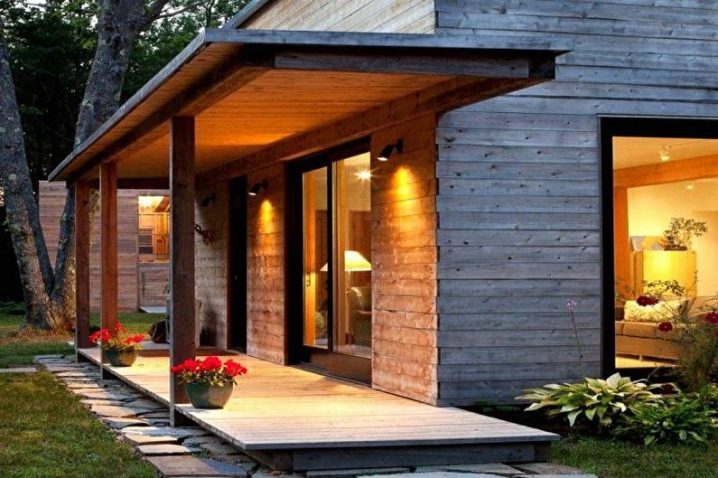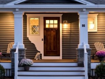 - За да придадете на дома си модерен вид, идеална е обикновена веранда без парапети и стъпала с прав правоъгълен балдахин. Разбира се, тази опция е възможна само при липса на сутерен. Земята близо до верандата е оградена с плоски декоративни камъни, а цялата конструкция е осветена от чифт модерно изглеждащи стенни лампи..