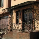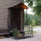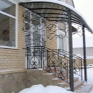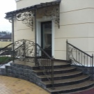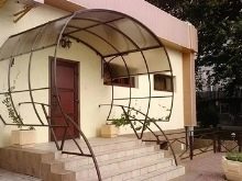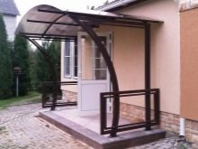 - Веранда с метална рамка и потъмнен сенник от поликарбонат изглежда лаконично и елегантно. И стълбовете, и парапетът на пристройката са украсени с елементи от ковано желязо, напомнящи за катерещи растения. Доста плосък сводест покрив, като е прозрачен, не потъмнява пространството близо до вратата, но предпазва от валежи.
