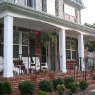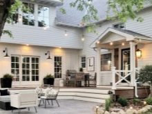 Между другото, той отеква много хармонично с полукръгъл прозорец и изглежда ефектно на фона на снежнобяла къща. Ниските стъпала на верандата са покрити с плочки.